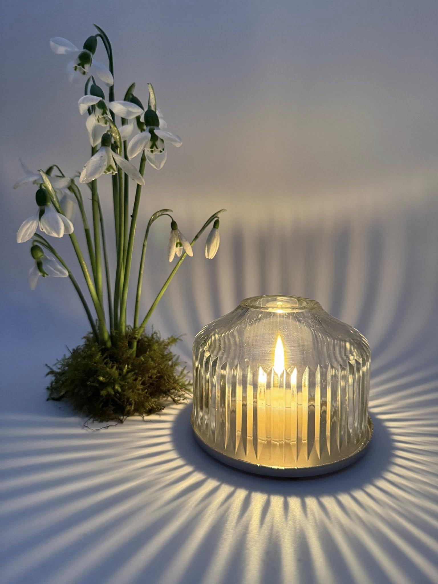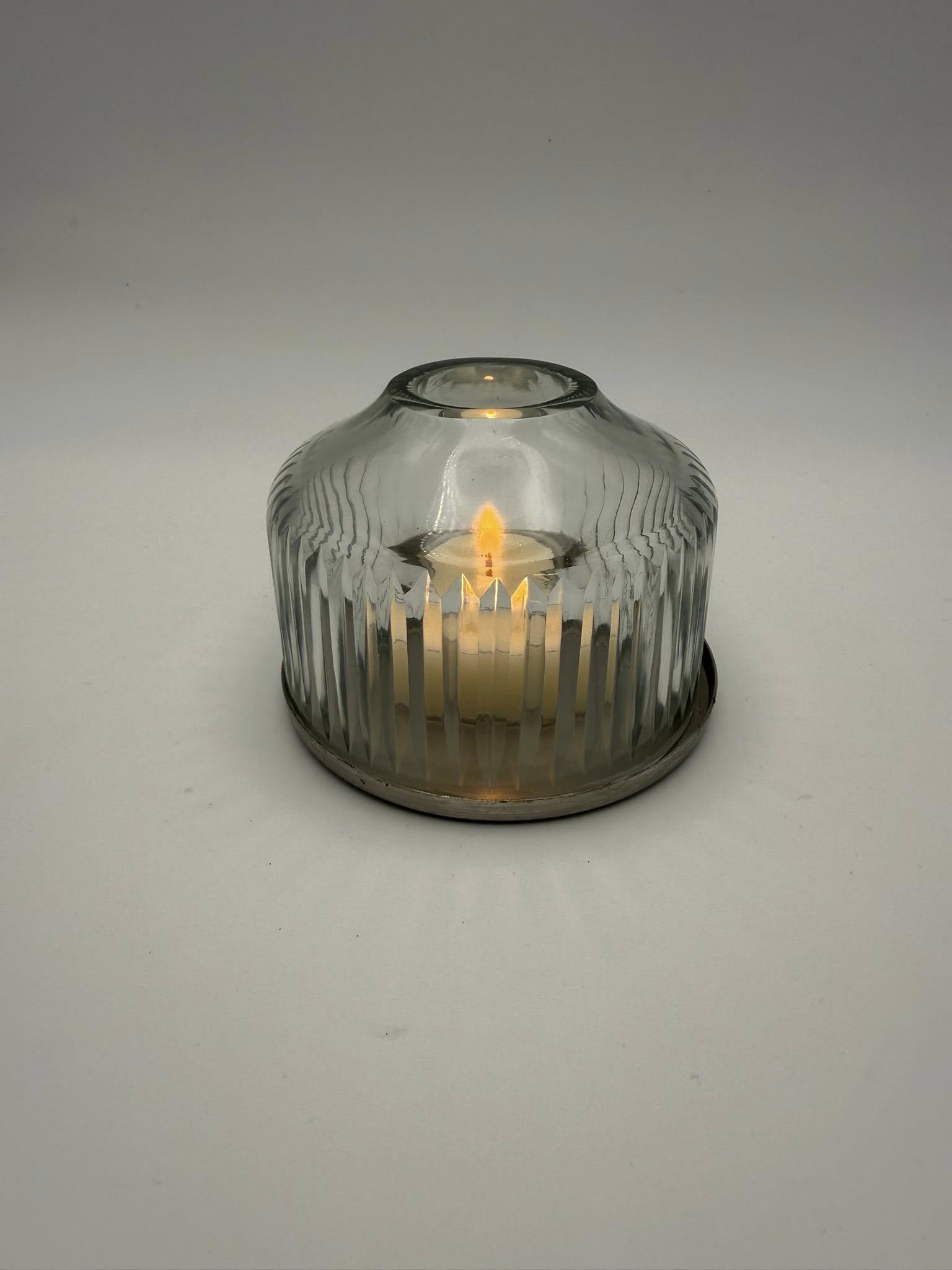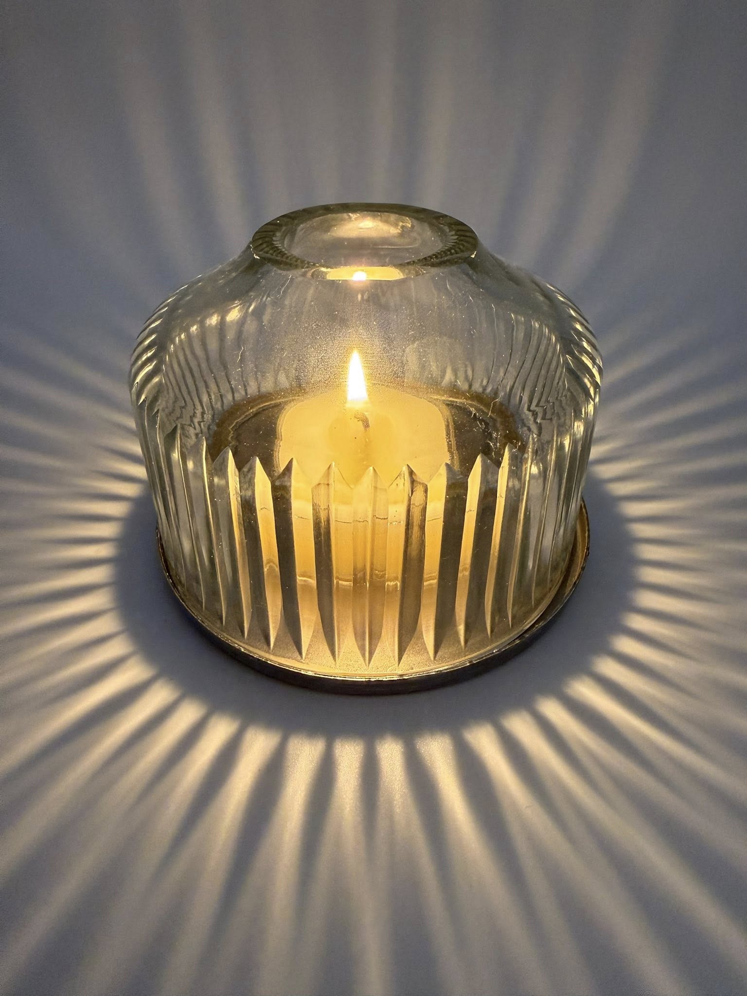 This handblown glass dome makes candlelight feel magical. The surface is etched with fine, Scandinavian-inspired lines that soften and scatter the glow, casting gentle shadows across nearby walls. Each vertical line is cut by hand, creating a subtle, rhythmic pattern that honours traditional craftsmanship and refined simplicity.