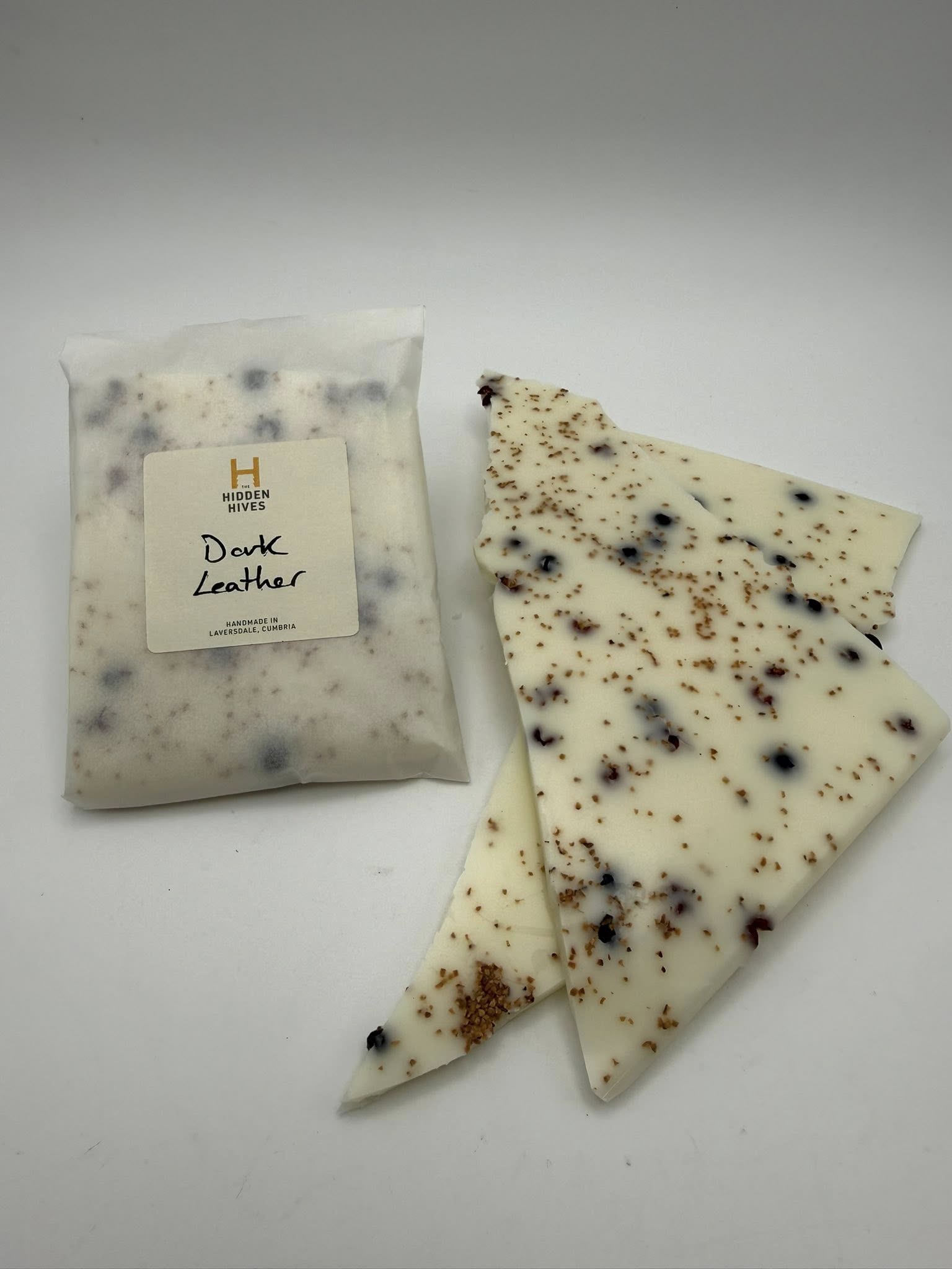 Each slab is hand poured and finished with carefully chosen botanicals that reflect the character of the fragrance. Once set, it is broken into irregular shards of tactile, textural pieces designed to be handled, snapped and layered.